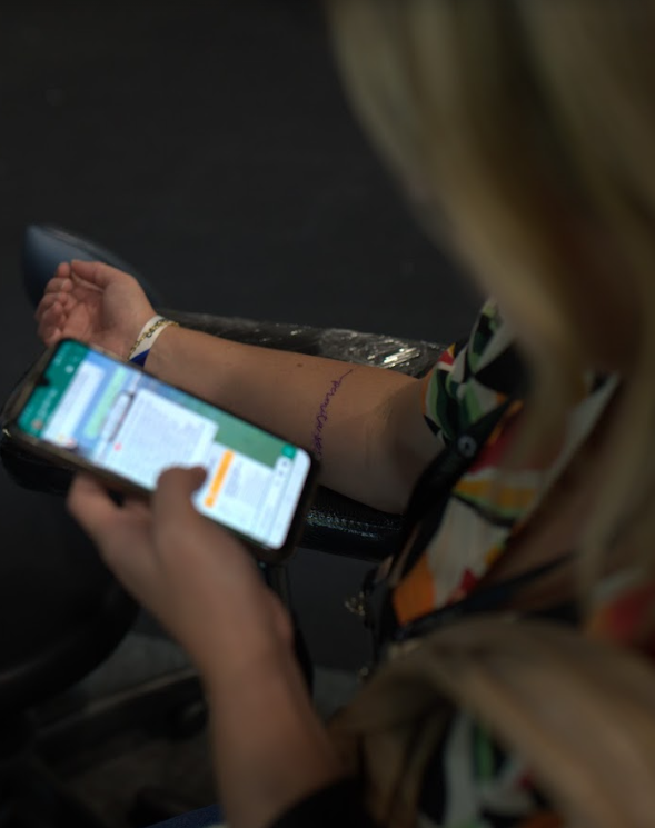 (Cliente da Score Media realizando tattoo no nosso stand enquanto gerencia as redes sociais da marca)